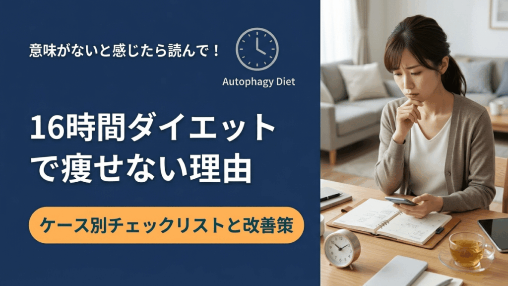 16時間断食(オートファジーダイエット)を続けているのに体重が変わらない、効果を感じられない。そう感じている方に向けて、ケース別の原因と具体的な改善策をまとめました。「意味ない」「自分には効かない」と諦める前に、まずこのチェックリストで自... -